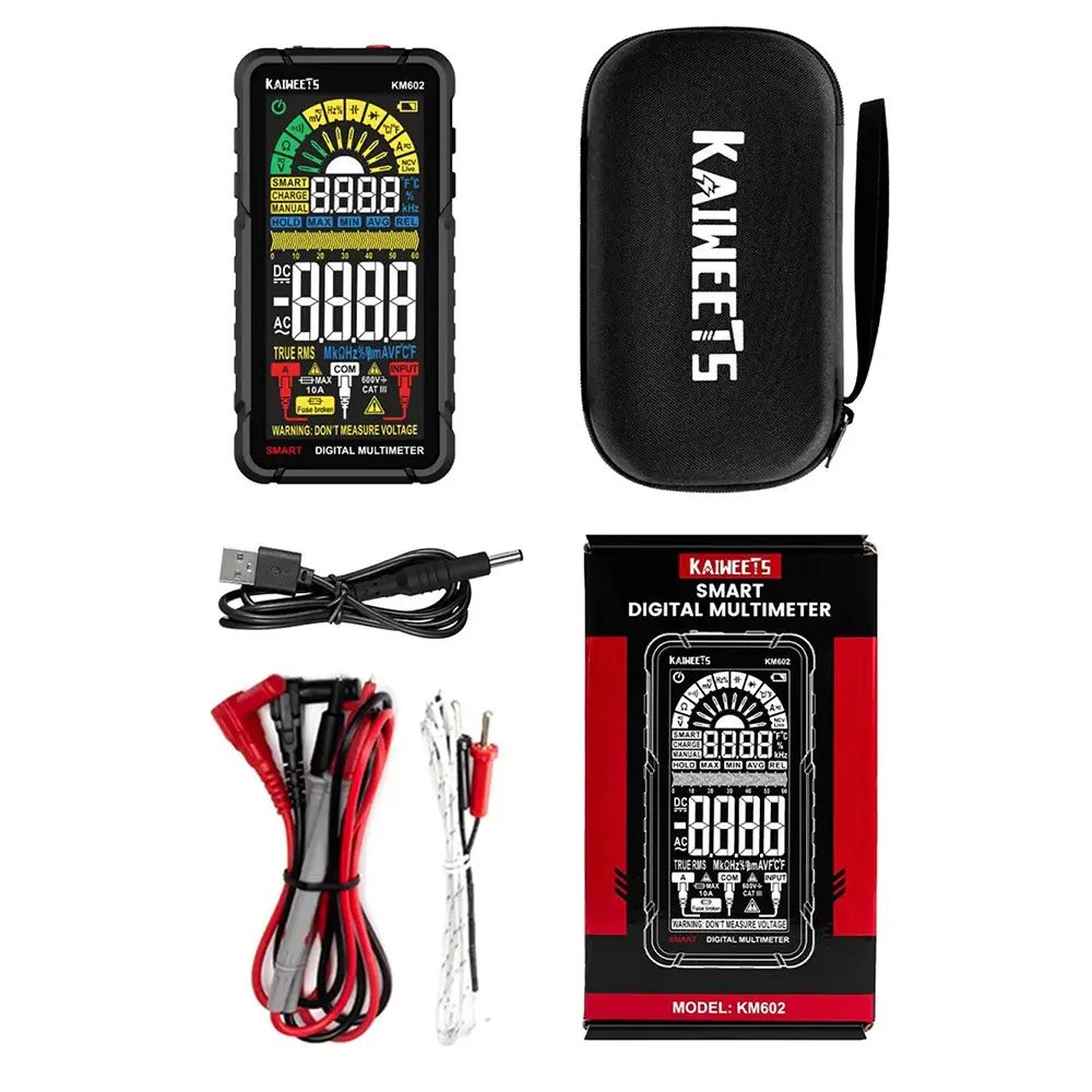 Le Multimètre Kaiweets KM602 est un appareil de mesure numérique True RMS conçu pour les diagnostics électriques courants en habitat, tertiaire et maintenance légère. Il combine un mode SMART automatique capable d’identifier tension, résistance et continuité, ainsi qu’un mode manuel pour les mesures plus spécifiques. Son alimentation Li‑ion rechargeable, son écran 6000 counts et ses fonctions intégrées (NCV, température, capacité, fréquence) en font un outil polyvalent pour les techniciens, artisans et utilisateurs avancés.